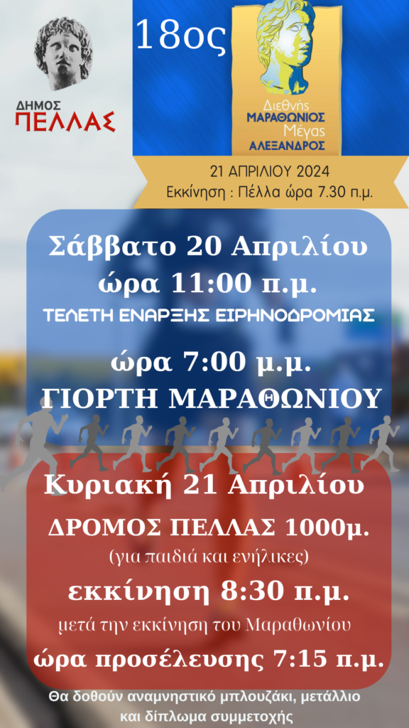 Η Τελετή Έναρξης της ΑΛΕΞΑΝΔΡΕΙΟΥ ΕΙΡΗΝΟΔΡΟΜΙΑΣ του 18ου Διεθνούς Μαραθωνίου θα πραγματοποιηθεί στον αρχαιολογικό χώρο της Πέλλας.