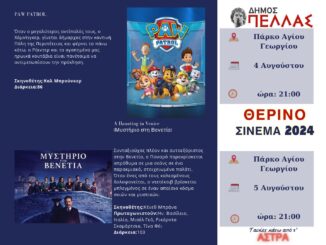 Ταινίες κάτω από τ´άστρα Κυριακή 4 Αυγούστου PAW PATROL (Παιδικό) Πάρκο Αγίου Γεωργίου Γιαννιτσά 9:00 μ.μ. Δευτέρα 5 Αυγούστου Μυστήριο στην Βενετία […]