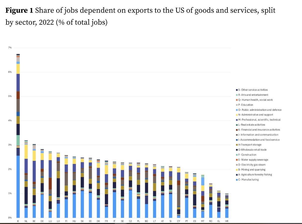 Η έκθεση ποικίλλει σημαντικά μεταξύ των χωρών της ΕΕ: το 6,7 % του συνόλου των θέσεων εργασίας στην Ιρλανδία συνδέεται με τις εξαγωγές προς τις ΗΠΑ, σε σύγκριση με μόλις 1 % στην Κροατία. H Eλλάδα βρίσκεται στην προτελευταία θέση, με περίπου 1,1% των συνολικών θέσεων εργασίας να εξαρτάται από τις εξαγωγές στις ΗΠΑ.