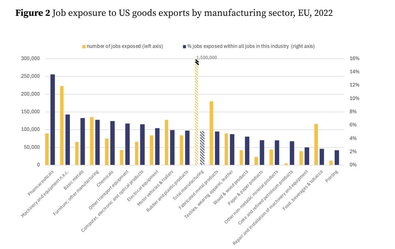 Αν και προσπαθούν να αποφύγουν την κινδυνολογία, τα συμπεράσματά τους προκαλούν εύλογη ανησυχία. Περίπου 5,2 εκατομμύρια θέσεις εργασίας σε όλη την ΕΕ υποστηρίζονται από τις εξαγωγές προς τις ΗΠΑ. Οι αλλαγές στην εμπορική πολιτική των ΗΠΑ θα μπορούσαν να επηρεάσουν δυσανάλογα ορισμένους τομείς και περιοχές περισσότερο από άλλους. Ειδικότερα, ο μεταποιητικός τομέας (τα φαρμακευτικά προϊόντα, τα μηχανήματα και ο εξοπλισμός) θα επηρεαστεί περισσότερο, καθώς και ορισμένες περιοχές στην Ιρλανδία, τη Βόρεια Ιταλία και τη Γερμανία.