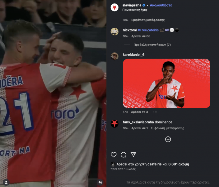 Μάλιστα, ήταν τόσα πολλά, που οι ιθύνοντες των social media της Σλάβια αποφάσισαν να περιορίσουν τα σχόλια και να κρατήσουν μόνο αυτά των συμπατριωτών τους, με… ελάχιστες εξαιρέσεις, όπως μπορείτε να δείτε στην παρακάτω φωτογραφία, με το hashtag, #FreeZafeiris