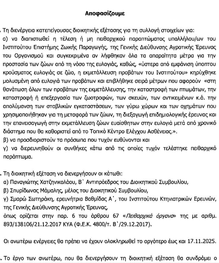 Τη «διενέργεια διοικητικής εξέτασης για τη διερεύνηση τυχόν πειθαρχικών ευθυνών υπάλληλου/ων του Ινστιτούτου Επιστήμης Ζωικής Παραγωγής της Γενικής Διεύθυνσης Αγροτικής Ερευνας, του ΕΛΓΟ-ΔΗΜΗΤΡΑ» παρήγγειλε πριν από μερικές μέρες, ο Νεκτάριος Βιδάκης, Α΄Αντιπροέδρος του Διοικητικού Συμβουλίου του οργανισμού.
