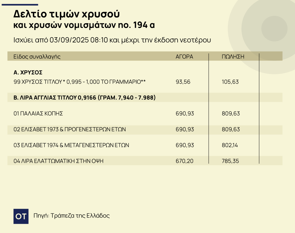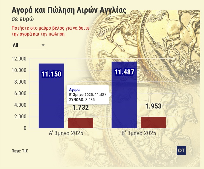 Σύμφωνα με στοιχεία, στο δεύτερο τρίμηνο 2025, οι ιδιώτες αγόρασαν από την Τράπεζα της Ελλάδος (ΤτΕ) μόλις 1.953 χρυσές λίρες, ενώ πούλησαν προς την ΤτE 11.487 χρυσές λίρες.
