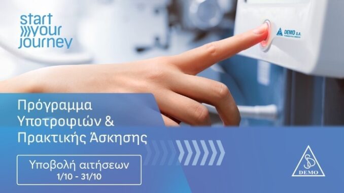 Σε νέους επιστήμονες που επιθυμούν να εξελιχθούν στον κλάδο του φαρμάκου απευθύνεται το «Start Your Journey” που υλοποιεί, για 8η συνεχή χρονιά, η φαρμακοβιομηχανία DEMO στο πλαίσιο ενός προγράμματος Υποτροφιών και Πρακτικής Άσκησης. Η περίοδος υποβολής αιτήσεων συμμετοχής στο πρόγραμμα λήγει στις 31 Οκτωβρίου 2025