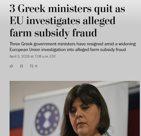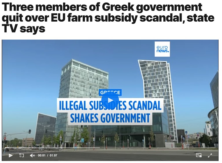 Η Washington Post αναφέρει ότι τρεις κορυφαίοι υπουργοί παραιτήθηκαν εν μέσω έρευνας της Ευρωπαϊκής Ένωσης για φερόμενη απάτη σε επιδοτήσεις. Πρόκειται για τον υπουργό Αγροτικής Ανάπτυξης Κώστα Τσιάρα, τον υπουργό Πολιτικής Προστασίας Γιάννη Κεφαλογιάννη και τον υφυπουργό Υγείας Δημήτρη Βαρτζόπουλο. Και οι τρεις αρνήθηκαν οποιαδήποτε παρανομία, υποστηρίζοντας ότι αποχωρούν ώστε να διευκολύνουν τη δικαστική διαδικασία.
