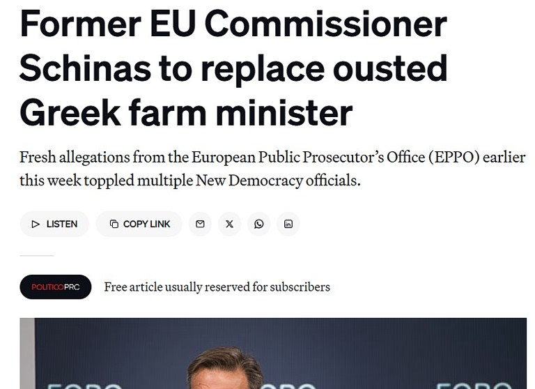 Το Politico δίνει ιδιαίτερη έμφαση στην ευρωπαϊκή διάσταση της υπόθεσης, αποκαλύπτοντας ότι ο πρώην αντιπρόεδρος της Ευρωπαϊκής Επιτροπής Μαργαρίτης Σχοινάς αναμένεται να αναλάβει το Υπουργείο Αγροτικής Ανάπτυξης, αντικαθιστώντας τον Τσιάρα. Η επιλογή αυτή ερμηνεύεται ως προσπάθεια ενίσχυσης της αξιοπιστίας της κυβέρνησης απέναντι στις Βρυξέλλες.