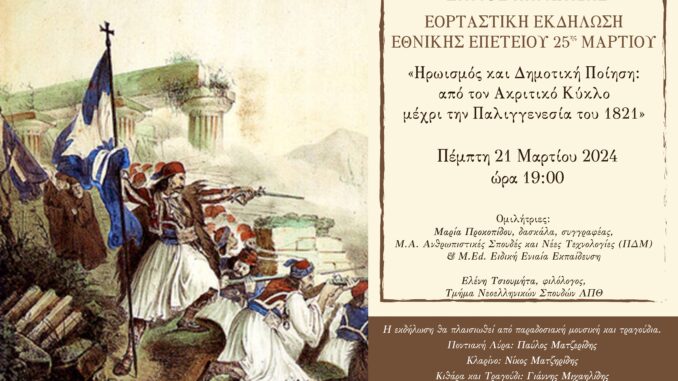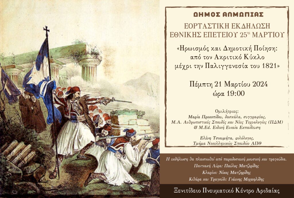 Ο Δήμος Αλμωπίας, με αφορμή τον εορτασμό της Εθνικής Επετείου της 25ης  Μαρτίου, διοργανώνει μία ιδιαίτερη εκδήλωση στο Ξενιτίδειο Πνευματικό Κέντρο Αριδαίας την Πέμπτη 21 Μαρτίου 2024, με τίτλο: «Ηρωισμός και Δημοτική Ποίηση: από τον Ακριτικό Κύκλο μέχρι την Παλιγγενεσία του 1821».