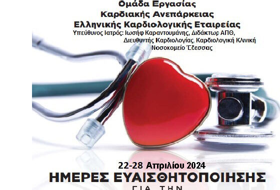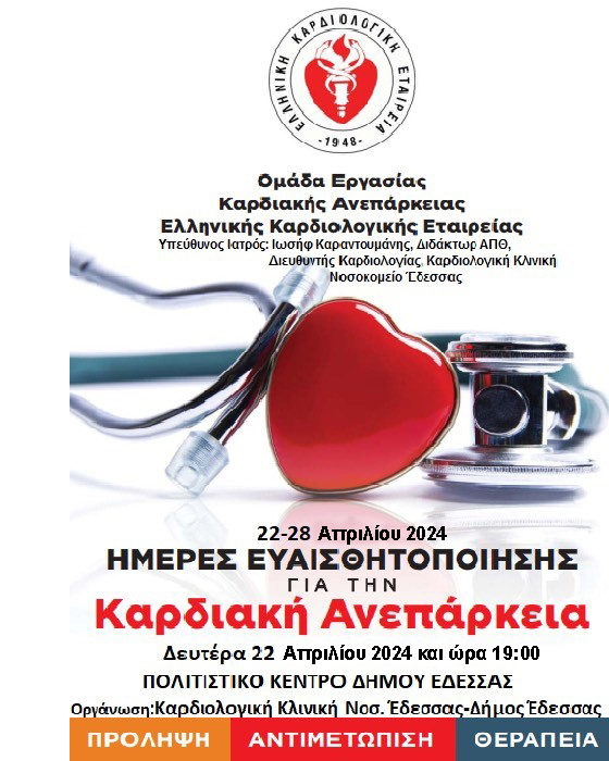 Η Ελληνική Καρδιολογική Εταιρεία, η Καρδιολογική Κλινική Νοσοκομείου Έδεσσας και ο Δήμος Έδεσσας διοργανώνουν ημερίδα ευαισθητοποίησης για την καρδιακή ανεπάρκεια, τη Δευτέρα 22 Απριλίου 2024 και ώρα 19:00 στο Πολιτιστικό Κέντρο Δήμου Έδεσσας