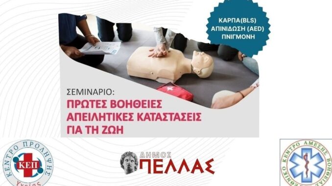 Ο Δήμος Πέλλας και το ΚΕΠ Υγείας, σε συνεργασία με το Εθνικό Κέντρο Άμεσης Βοήθειας (ΕΚΑΒ), διοργανώνουν δωρεάν σεμινάριο πρώτων βοηθειών μεθέμα: