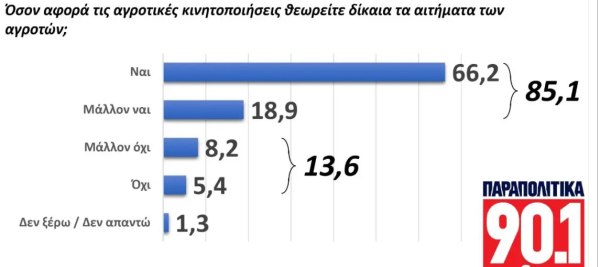 Στη δημοσκόπηση της GPO για τα Παραπολιτικά το 86% όσων συμμετείχε στη έρευνα απαντά ότι είναι δίκαια τα αιτήματα των αγροτών ενώ σε ποσοστό 65% υποστηρίζουν ότι είναι δικαιολογημένες και οι κινητοποιήσεις τους που περιλαμβάνουν και το κλείσιμο εθνικών δρόμων.