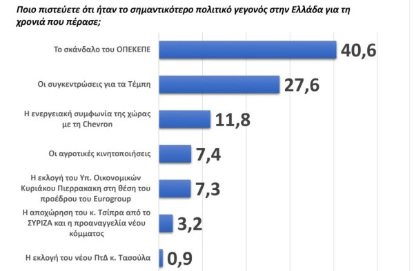 Την ίδια στιγμή φαίνεται πως το σκάνδαλο του ΟΠΕΚΕΠΕ έχει αφήσει βαρύ αποτύπωμα, καθώς οι πολίτες αναφέρουν ότι ήταν με διαφορά το σημαντικότερο πολιτικό γεγονός στην Ελλάδα τη χρονιά που πέρασε (ποσοστό 40,6%) ενώ ακολουθούν οι συγκεντρώσεις για τα Τέμπη (27,6%).