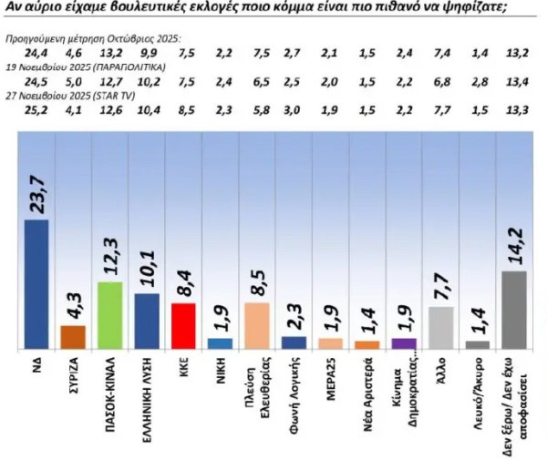 Αναφορικά με την πρόθεση ψήφου, η ΝΔ συγκεντρώνει 23,7% χάνοντας μέρος των δυνάμεών της σε σχέση με την προηγούμενη μέτρηση. Το ΠΑΣΟΚ συγκεντρώνει το 12,3%, η Ελληνική Λύση 10,1%, η Πλεύση Ελευθερίας 8,5% και το ΚΚΕ 8,4%.