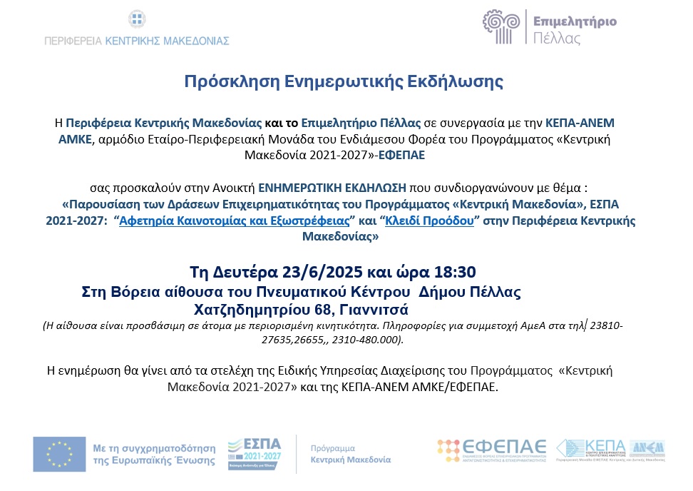 Παρουσίαση των Δράσεων Επιχειρηματικότητας ΕΣΠΑ 2021-2027 τη Δευτέρα 23/6/2025 και ώρα 18:30 στα Γιαννιτσά 2021-2027 τη Δευτέρα 23/6/2025 και ώρα 18:30 στα Γιαννιτσά.
