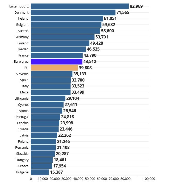 Ο μέσος ετήσιος μισθός ανά εργαζόμενο στην ΕΕ είναι 39.808 ευρώ. Μεταξύ των χωρών της ΕΕ, κυμαίνεται από 15.387 ευρώ στη Βουλγαρία έως 82.969 ευρώ στο Λουξεμβούργο, που είναι 5,4 φορές υψηλότερος.