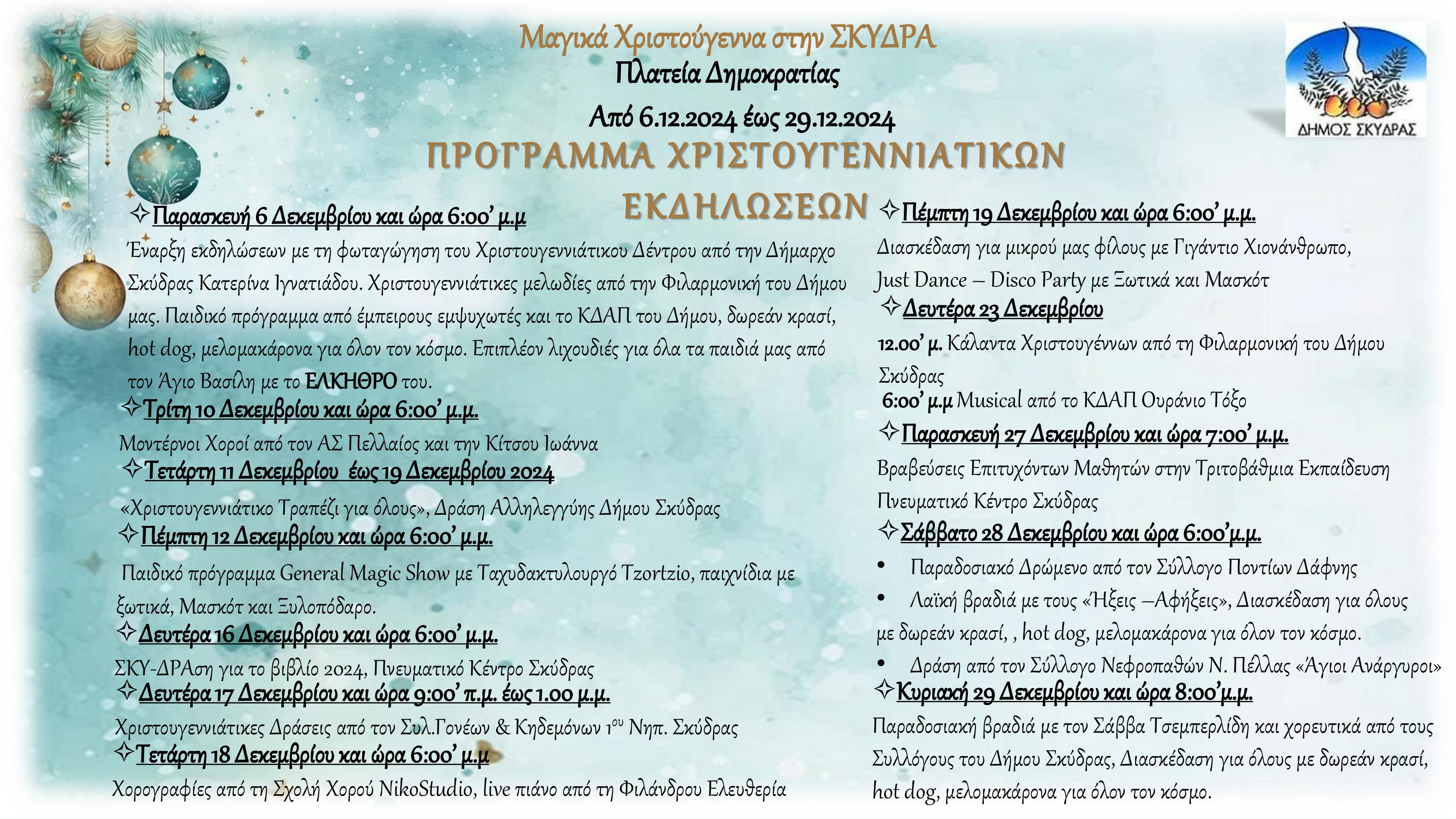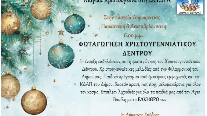 Οι γιορταστικές εκδηλώσεις των Χριστουγέννων και της Πρωτοχρονιάς του Δήμου Σκύδρας ξεκινούν επίσημα με τη φωταγώγηση του Χριστουγεννιάτικου Δέντρου στην πλατεία Δημοκρατίας, την Παρασκευή 6 Δεκεμβρίου 2024, στις 06:00΄μ.μ.