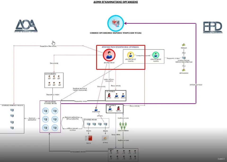 Όπως προέκυψε από την έρευνα, οι κατηγορούμενοι, τουλάχιστον από τον Ιανουάριο του 2018, ενώθηκαν μεταξύ τους και σύστησαν εγκληματική οργάνωση με επιχειρησιακή δομή, διαρκή δράση και διακριτούς ρόλους, με σκοπό τη διάπραξη δωροδοκιών, ψευδών βεβαιώσεων και απατών σε βάρος του Εθνικού Οργανισμού Παροχής Υπηρεσιών Υγείας (Ε.Ο.Π.Υ.Υ), την παράνομη επεξεργασία προσωπικών δεδομένων, καθώς και τη νομιμοποίηση των παράνομων εσόδων που προέκυπταν από τις πράξεις αυτές.