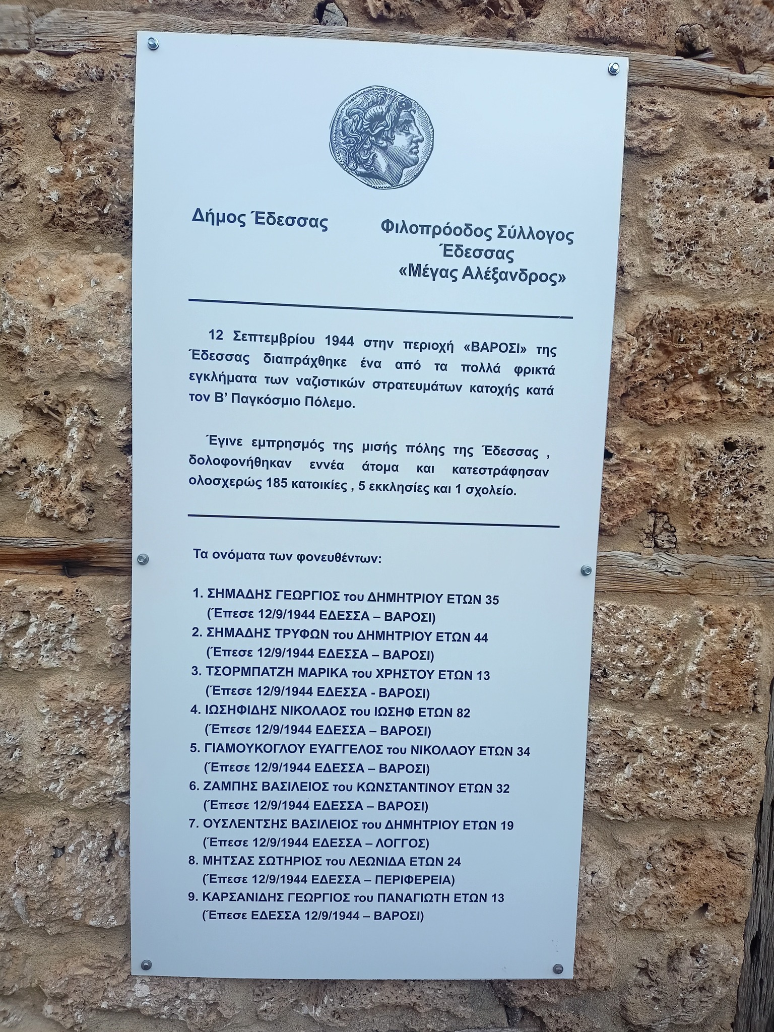 Με την επιμνημόσυνη δέηση και τα αποκαλυπτήρια της αναθηματικής πλάκας ξεκίνησαν οι εκδηλώσεις μνήμης και τιμής στα θύματα από την πυρκαγιά στο Βαρόσι της Έδεσσας (12 Σεπτεμβρίου 1944). Σήμερα 81 χρόνια μετά ο Δήμος Έδεσσας και ο Φιλοπρόοδος Σύλλογος Έδεσσας «Μέγας Αλέξανδρος» τοποθετούν την Έδεσσα στο χάρτη της ιστορικής μνήμης.