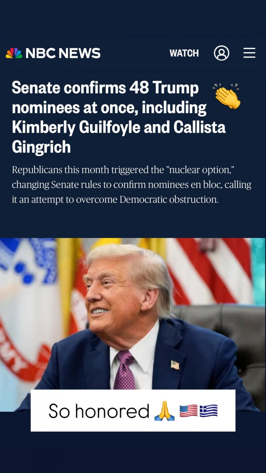 Μέσα από ένα story στον προσωπικό της λογαριασμό στο instragram, η Κιμπερλι Γκλιλφόιλ επιβεβαίωσε τον διορισμό της γράφοντας «τι τιμή», με μια σημαία της Ελλάδας και των ΗΠΑ.