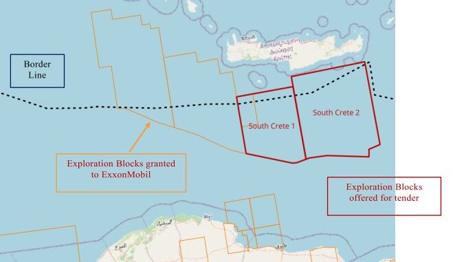 • Αξίζει να αναφερθεί ότι η κυβέρνηση της Ελλάδας έχει παραχωρήσει δύο τεμάχια που βρίσκονται εντός των θαλάσσιων συνόρων της Λιβύης τόσο στην Total όσο και στην ExxonMobil (χάρτης 2)*. Η ExxonMobil απέκτησε στη συνέχεια το μερίδιο της Total και ακολούθησε ερευνητική δραστηριότητα που συνίσταται σε σεισμική έρευνα 2D το 2022 και σε σεισμική έρευνα 3D το 2024, μαζί με την ανακοίνωση της πρόθεσής της να πραγματοποιήσει ερευνητική γεώτρηση».