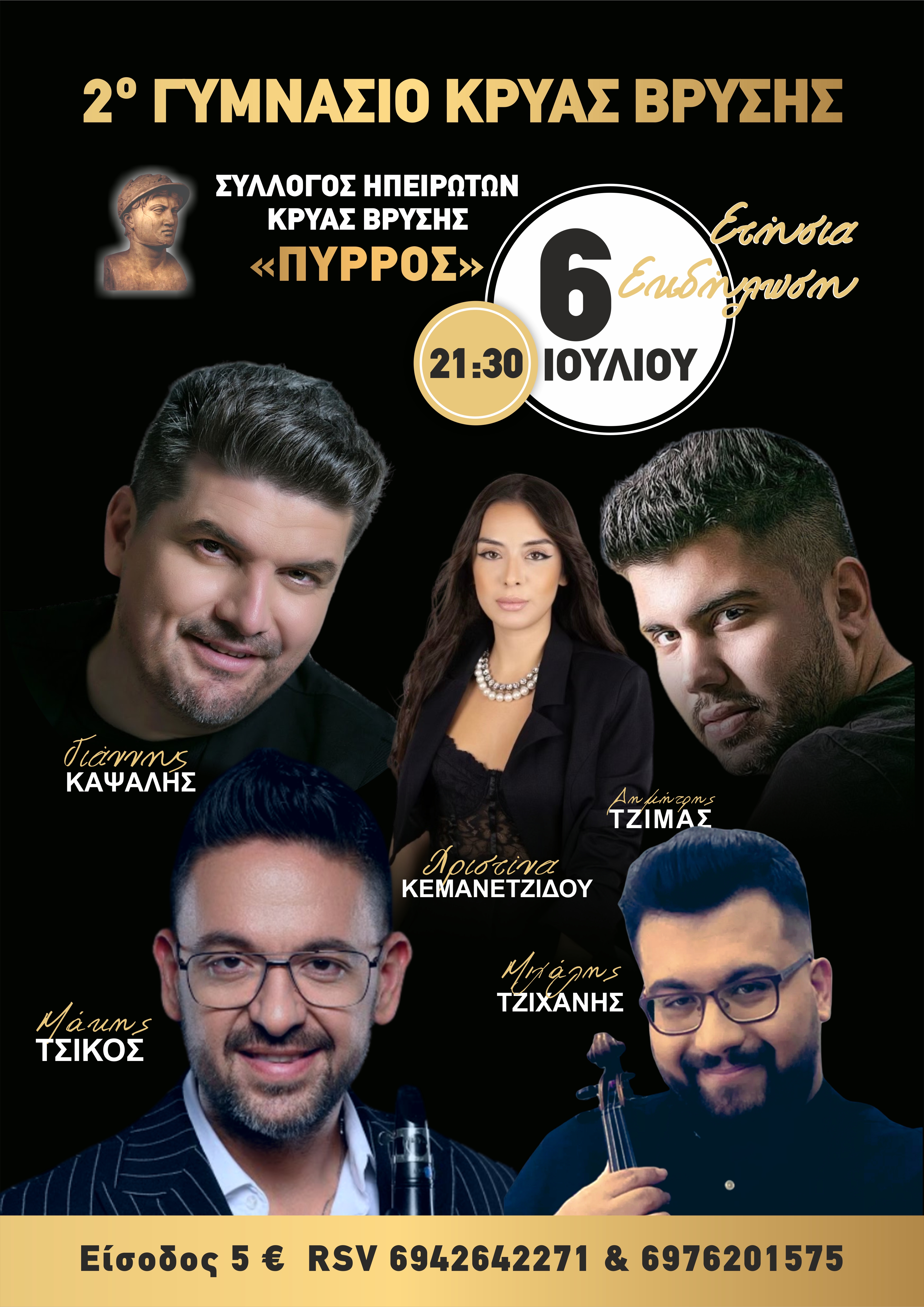 Σε μια μοναδική διοργάνωση, η οποία έχει γίνει θεσμός για τον Σύλλογο, την Κρύα Βρύση αλλά και την Πέλλα γενικότερα ο σπουδαίος τραγουδιστής Γιάννης Καψάλης ο μοναδικός σολίστ Μάκης Τσίκος στο κλαρίνο, ο πολλά υποσχόμενος Δημήτρης Τζίμας, ο σολίστ του βιολιού Μιχάλης Τζιχάνης, μαζί με τη Χριστίνα Κεμανετζίδου και όλο το επιτελείο τους θα δώσουν τον καλύτερο εαυτό τους για να περάσουμε όλοι μια ανεπανάληπτη βραδιά!