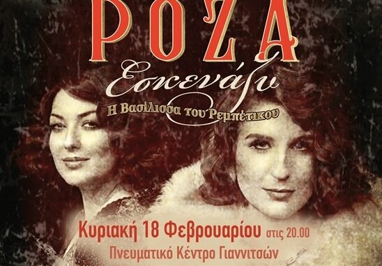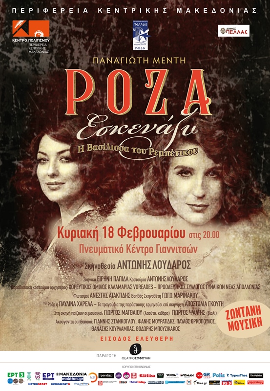 Το Κέντρο Πολιτισμού Περιφέρειας Κεντρικής Μακεδονίας σε συνεργασία με την Περιφερειακή Ενότητα Πέλλας και τον Δήμο Πέλλαςπαρουσιάζει την θεατρική παράσταση «ΡΟΖΑ ΕΣΚΕΝΑΖΥ» – Η Βασίλισσα του Ρεμπέτικου, του Παναγιώτη Μέντη και σκηνοθεσία Αντώνη Λουδάρου.