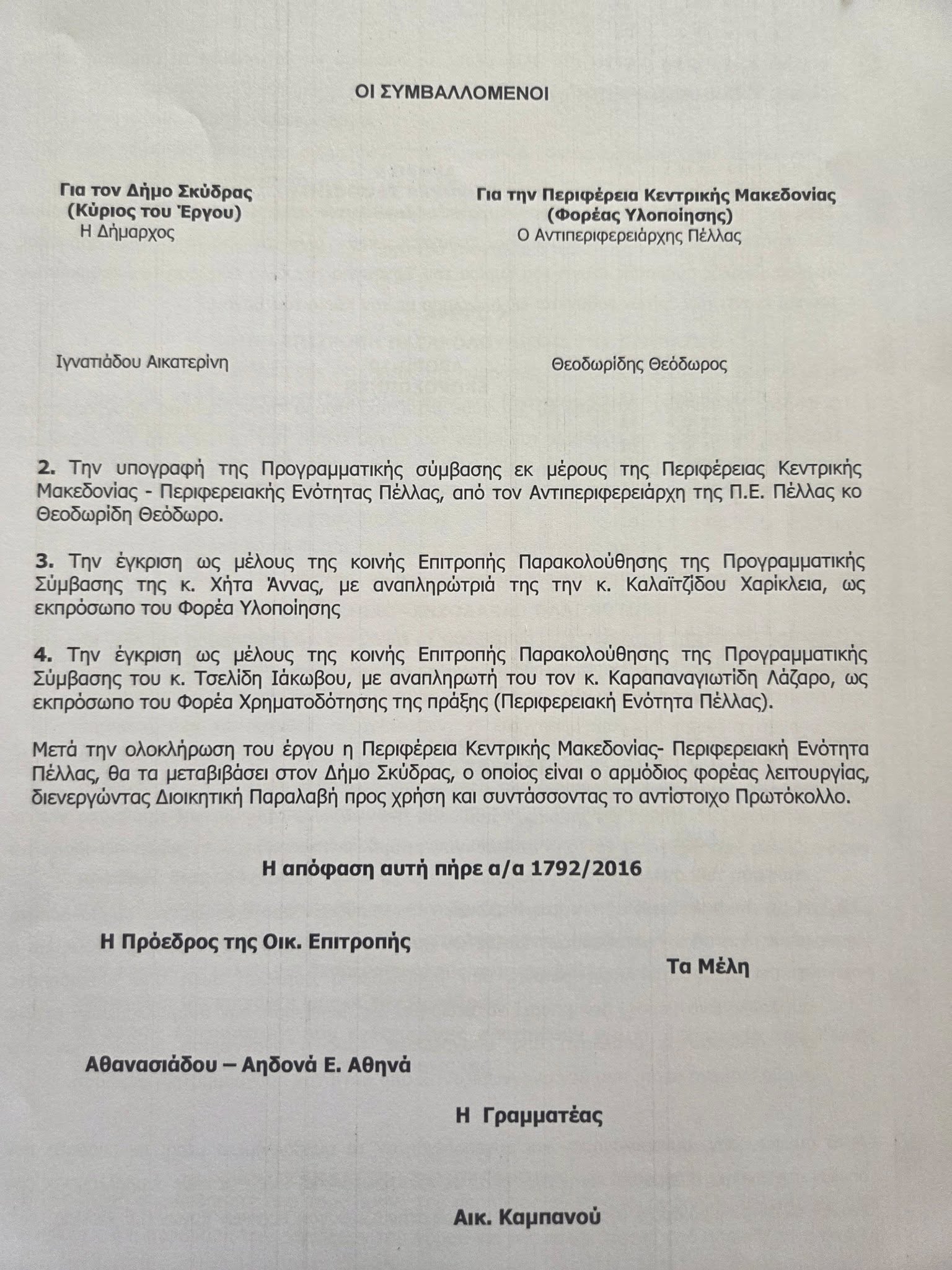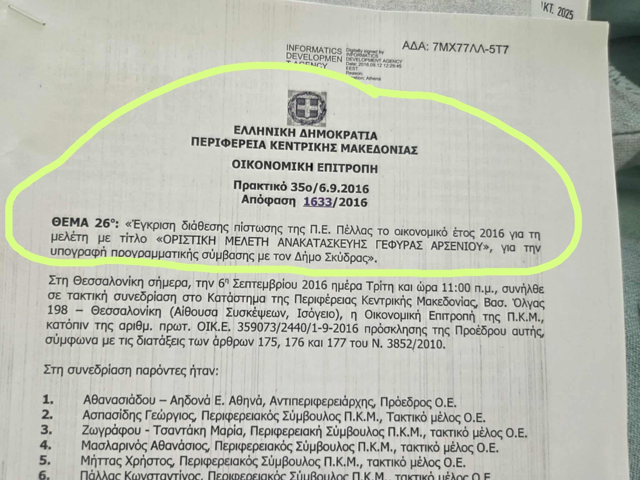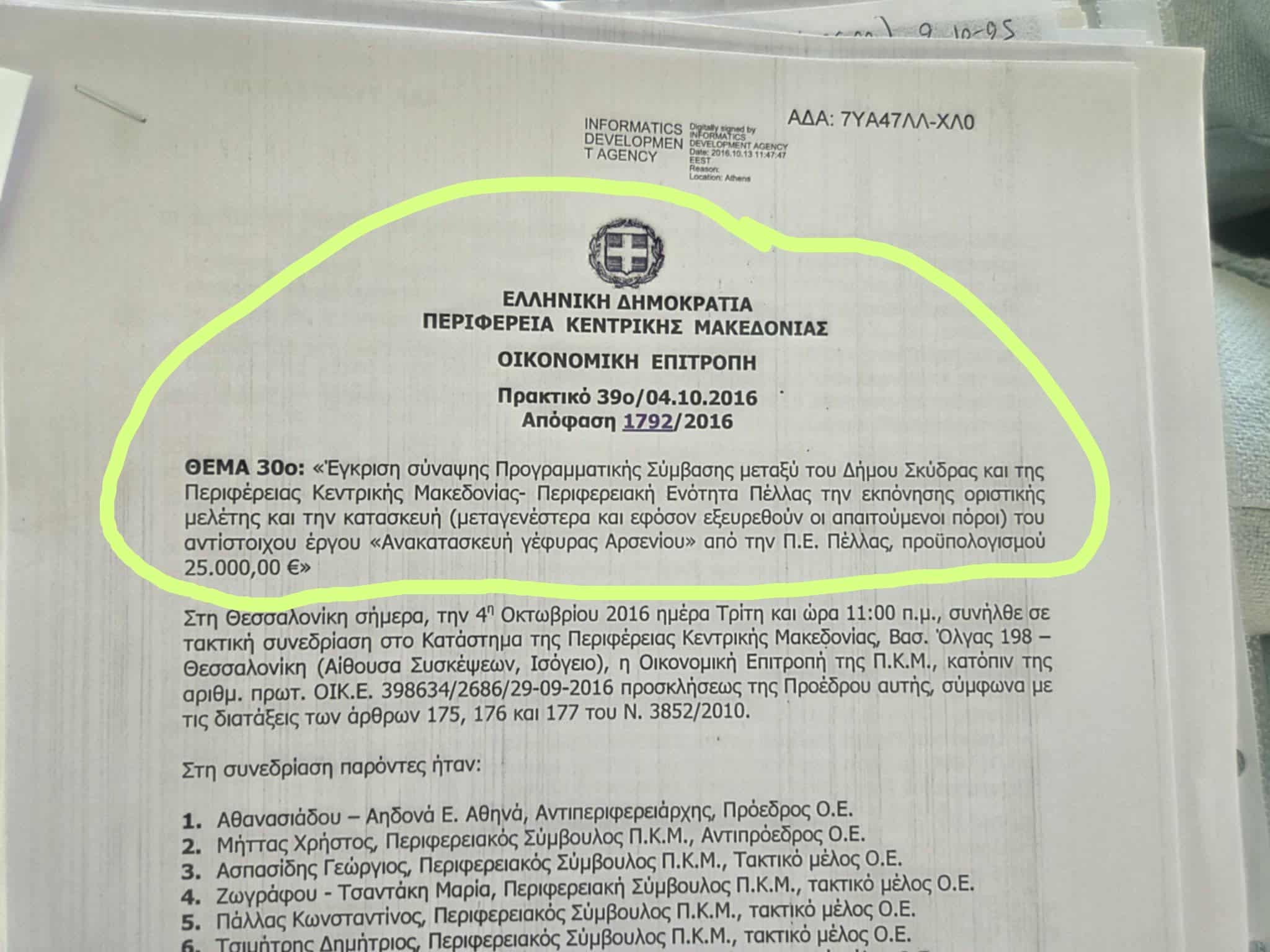 Έγγραφο 1ον: η με αριθμό απόφαση του δημοτικού συμβουλίου Σκύδρας με τίτλο..