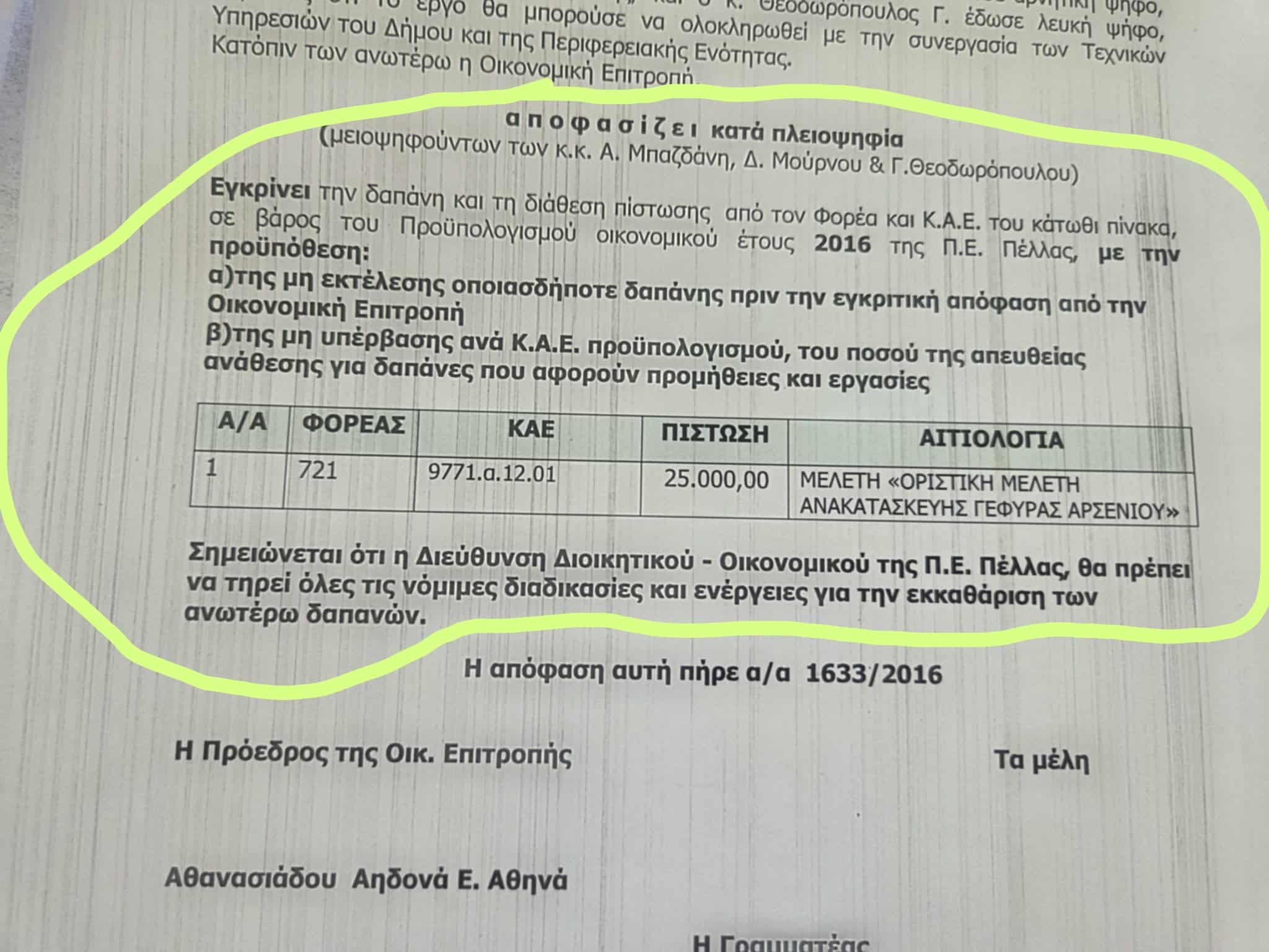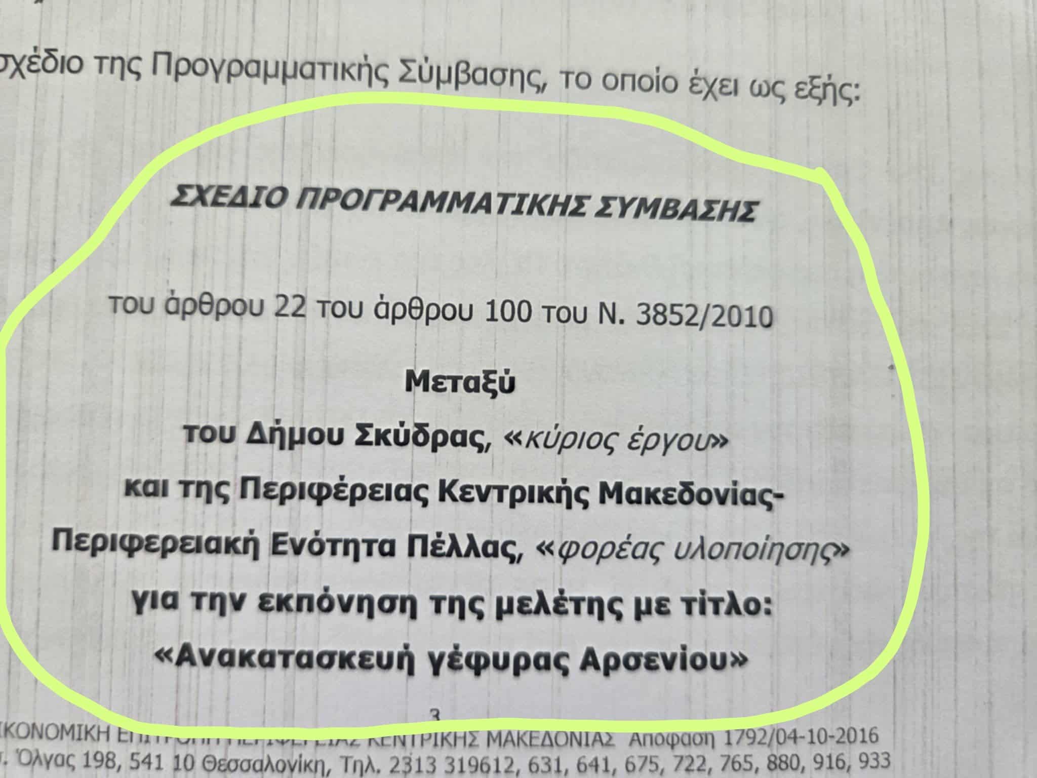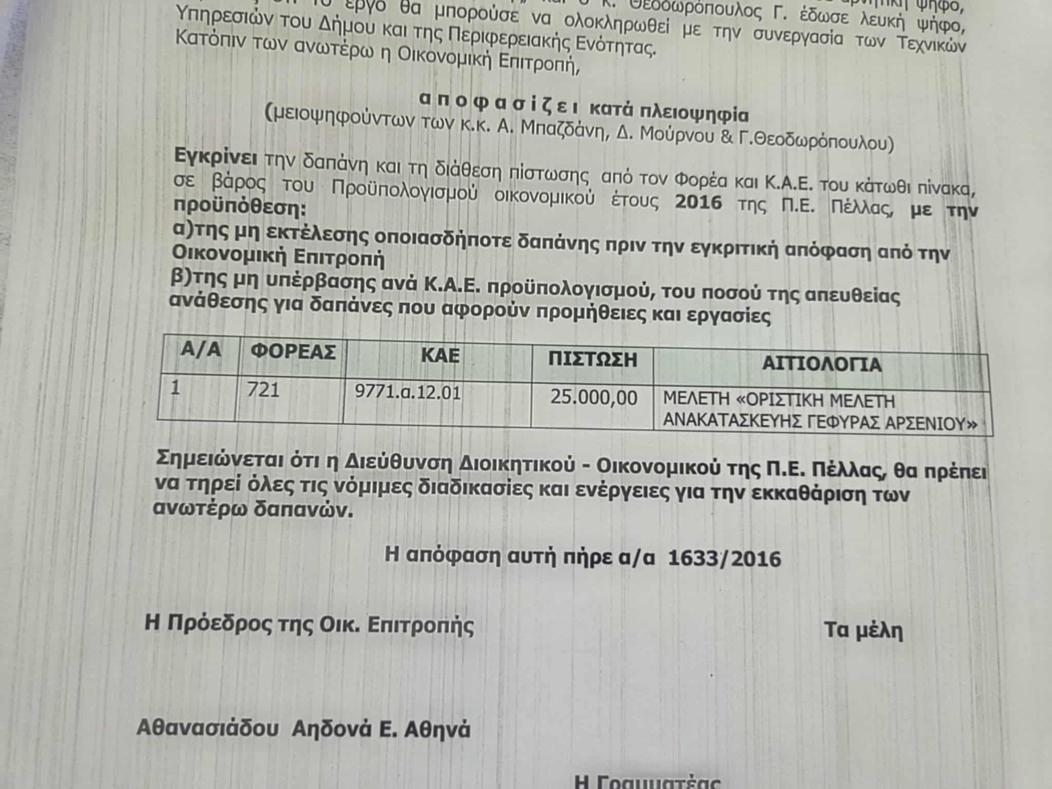 Απ όλα τα παραπάνω αποδεικνύεται ξεκάθαρα ότι από την πρώτη μας θητεία, φροντίσαμε να ενταχθεί το μεγάλο έργο της κατασκευής νέας γέφυρας στο Αρσένι μαζί με τις απαιτούμενες μελέτες, στο πρόγραμμα της Περιφέρειας Κεντρικής Μακεδονίας, ως ένα από τα έργα της, μάλιστα το εξήγγειλε και το υποσχέθηκε δις, δύο φορές δημόσια ενώπιον πλήθους δημοτών μας, ο ίδιος ο Περιφερειάρχης Κεντρικής Μακεδονίας, Απόστολος Τζιτζικώστας, παρουσία και του αντιπεριφερειάρχη Πέλλας, μάλιστα υπάρχει και σχετικό οπτικοακουστικό υλικό που κυκλοφορεί στο διαδίκτυο.