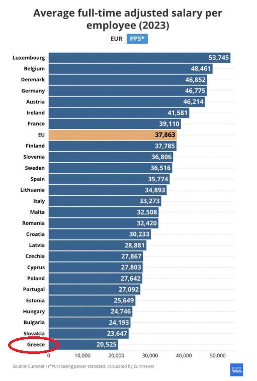 Ο μέσος ελληνικός μισθός, που έχει μια ισοδύναμη αγοραστική αξία ίση με 20.525 ευρώ ετησίως, υπολείπεται πολύ από το μισό της αγοραστικής δύναμης του μέσου ευρωπαϊκού μισθού, που είναι 37.863 ευρώ ετησίως.
