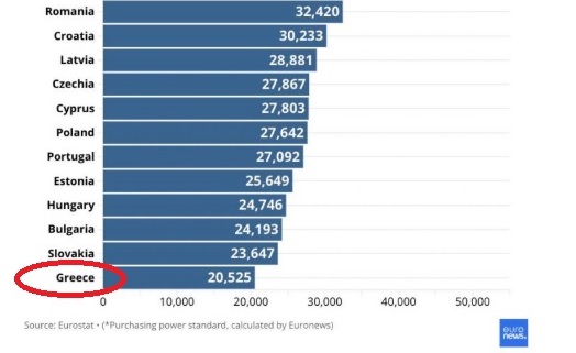 Ξεπεράσαμε ακόμη και τη Ρουμανία και τη Βουλγαρία, με τις οποίες ανταγωνιζόμασταν στις τελευταίες θέσεις τα τελευταία χρόνια. Πλέον βρισκόμαστε μόνοι μας στην τελευταία θέση ως προς την αγοραστική αξία των μισθών μας.