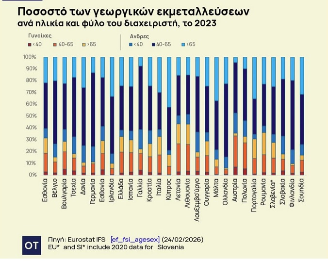 Αποκαλυπτικά είναι τα στοιχεία που παρουσιάζονται στην έκθεση της Κομισιόν, όπου σύμφωνα με αυτά: Το 2023, οι γυναίκες διαχειρίζονται περίπου το 32% των αγροτικών εκμεταλλεύσεων στην ΕΕ, παρουσιάζοντας ελαφρά αύξηση του μεριδίου τους από το 2010, αλλά σταθερότητα από το 2020. Το ποσοστό αυτό ποικίλλει σημαντικά μεταξύ των κρατών μελών, με ακραίες τιμές από 6% στις Κάτω Χώρες έως 44% στη Λετονία.