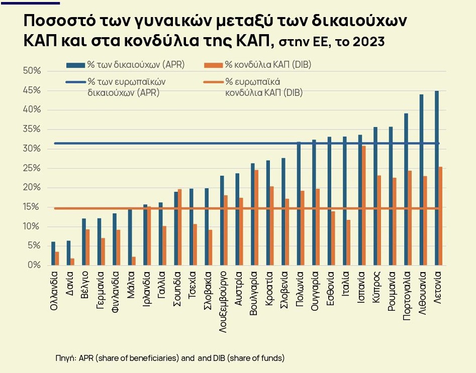 Αν και οι γυναίκες αντιπροσωπεύουν το 31% των δικαιούχων, λαμβάνουν μόνο το 15% των συνολικών πληρωμών της ΚΑΠ