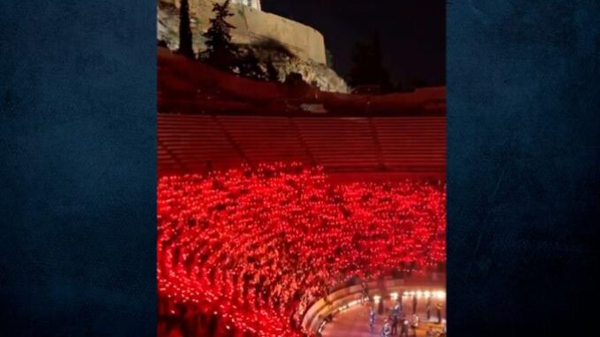 To κοινό τραγουδάει το «Feels Like I’m Falling In Love», ενώ τα led βραχιόλια που φορούν, αναβοσβήνουν στο ρυθμό του τραγουδιού, δημιουργώντας μία μαγική ατμόσφαιρα.