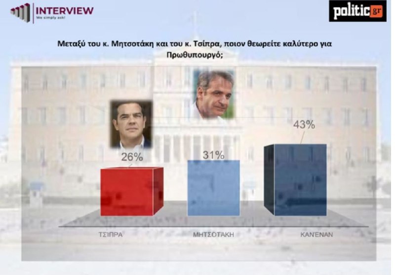 Συνεχίζεται η κυβερνητική και πρωθυπουργική φθορά στην πρώτη δημοσκόπηση μετά την ανάπαυλα του καλοκαιριού, με τη ΝΔ να υποχωρεί αισθητά σε σχέση με τον Ιούνιο, σχεδόν πέντε μονάδες, στη μέτρηση της εταιρείας Interview για το Politic, την ώρα που η κρίση εμπιστοσύνης στο πρόσωπο του Κυριάκου Μητσοτάκη αυξάνεται. Ενδιαφέρον έχουν και οι απαντήσεις των πολιτών στην ερώτηση ποιον θεωρούν καταλληλότερο πρωθυπουργό μεταξύ του Αλέξη Τσίπρα και του Κυριάκου Μητσοτάκη, η οποία τίθεται ευθέως πλέον -και αυτό έχει μια σημασία- παρά το γεγονός ότι ο τελευταίος δεν έχει ανακοινώσει κάτι συγκεκριμένο.