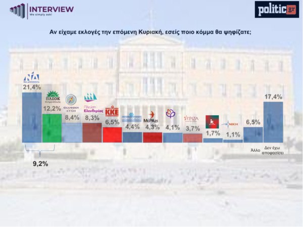 Κάτω από το όριο του 3% είναι η Νέα Αριστερά με 1,7% και η Νίκη με 1,1%. Άλλο επέλεξαν 6,5% των ερωτηθέντων και «δεν έχω αποφασίσει» απάντησε το 17,4%.