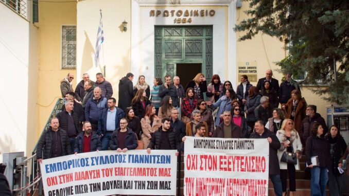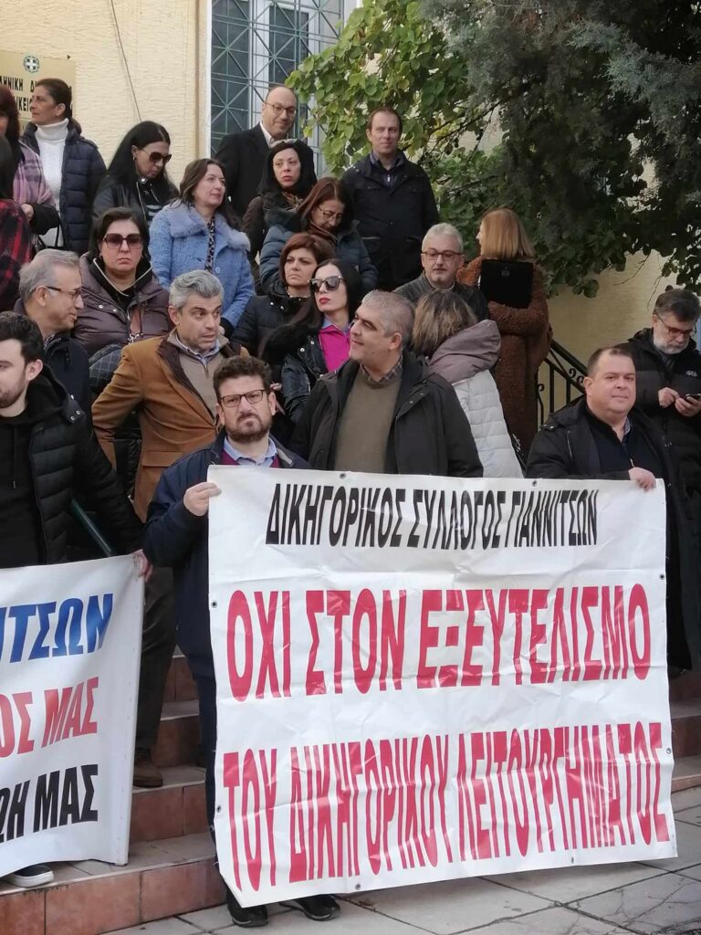 Τα μέλη επιστημονικών, επαγγελματικών και συνδικαλιστικών φορέων της πόλης, εργαζόμενοι και αυτοαπασχολούμενοι, πραγματοποίησαν σήμερα Πέμπτη, 07 Δεκεμβρίου 2023, και ώρα 11:00, έξω από το Πρωτοδικείο Γιαννιτσών, συμβολική παράσταση διαμαρτυρίας ενάντια στο υπό ψήφιση σχέδιο νόμου της κυβέρνησης «Μέτρα για τον περιορισμό της φοροδιαφυγής».
