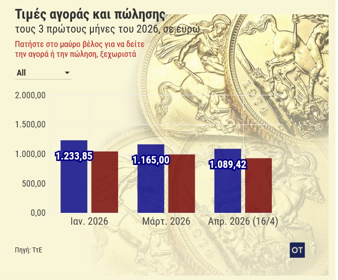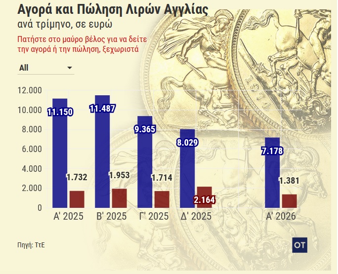 Το πρώτο τρίμηνο του 2026 ρευστοποιήθηκαν 7.178 χρυσές λίρες, ενώ αγοράστηκαν 1.381 λίρες.