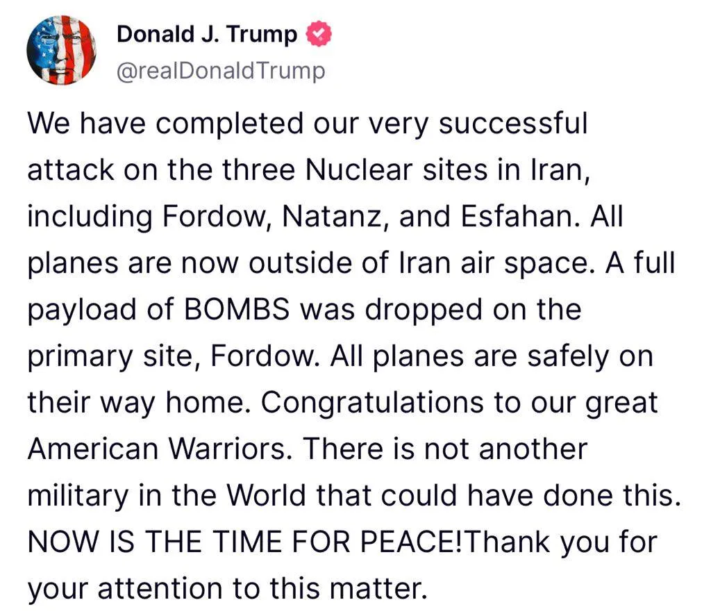 Ο πρόεδρος των ΗΠΑ, Ντόναλντ Τραμπ, ανακοίνωσε ότι «Ολοκληρώσαμε την πολύ επιτυχημένη επίθεσή μας στις τρεις πυρηνικές εγκαταστάσεις στο Ιράν, συμπεριλαμβανομένων των Φόρντοου, Νατάνζ και Ισφαχάν. Όλα τα αεροπλάνα βρίσκονται τώρα εκτός του εναέριου χώρου του Ιράν. Πλήρες φορτίο βομβών έπεσε στην κύρια τοποθεσία, Φόρντοου. Όλα τα αεροπλάνα βρίσκονται με ασφάλεια στο δρόμο για την πατρίδα τους. Συγχαρητήρια στους σπουδαίους Αμερικανούς πολεμιστές μας. Δεν υπάρχει άλλος στρατός στον κόσμο που θα μπορούσε να το κάνει αυτό. ΤΏΡΑ ΕΊΝΑΙ Η ΏΡΑ ΓΙΑ ΤΗΝ ΕΙΡΉΝΗ! Σας ευχαριστώ για την προσοχή σας σε αυτό το θέμα».