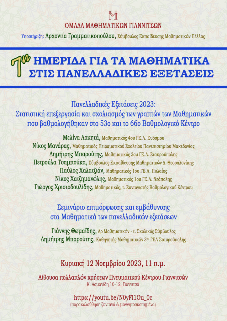 Η Ομάδα Μαθηματικών Γιαννιτσών με την υποστήριξη της Συμβούλου Εκπαίδευσης Μαθηματικών Πέλλας Αρχοντίας Γραμματικοπούλου διοργανώνει για 7η χρονιά Ημερίδα για τα Μαθηματικά στις Πανελλαδικές Εξετάσεις αυτήν την Κυριακή 12 Νοεμβρίου 2023 στις 11 το πρωί, στην αίθουσα πολλαπλών χρήσεων του Πνευματικού Κέντρου Γιαννιτσών.