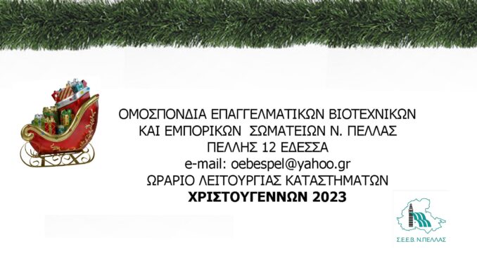 Η Ομοσπονδία Επαγγελματικών Βιοτεχνικών και Εμπορικών Σωματείων Ν. Πέλλας σας ενημερώνει για το Χριστουγεννιάτικο Εορταστικό ωράριο των καταστημάτων .