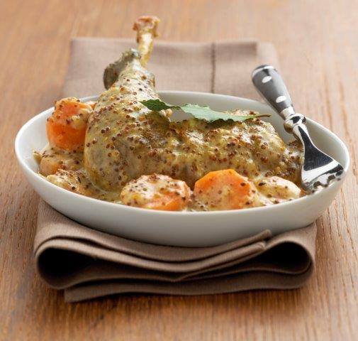Συνταγή για φραγκόκοτα στη γάστρα με μουστάρδα, μπέικον και κρέμα
