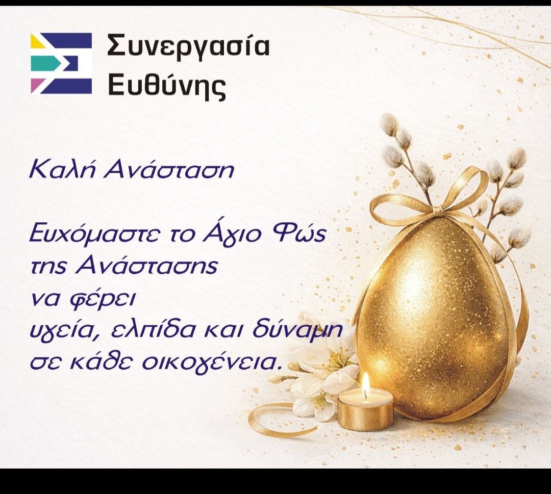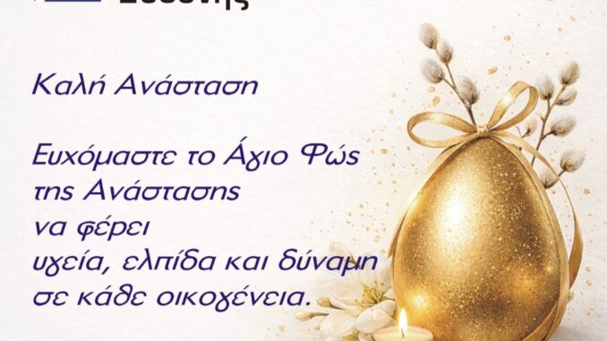 Με αφορμή τις Άγιες Ημέρες του Πάσχα, η Δημοτική Παράταξη «Συνεργασία Ευθύνης» του Δήμου Έδεσσας απευθύνει θερμές ευχές προς όλους τους πολίτες.