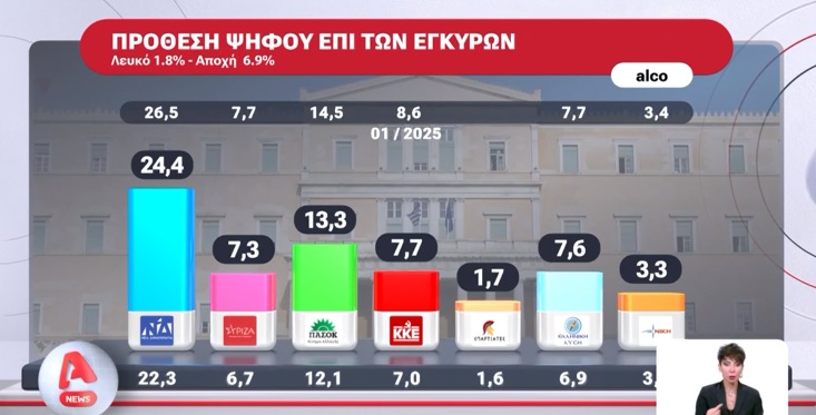 Όσο για την πρόθεση ψήφου, η ΝΔ βρίσκεται με απώλειες στην πρώτη θέση, καθώς συγκεντρώνει ποσοστό 24,4%.