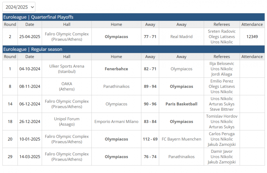 Ενώ ήταν και στο ματς της περιόδου 2023-24, όταν στις 14 Μαρτίου του 2024 οι «ερυθρόλευκοι» είχαν επικρατήσει και πάλι. Κοινή συνισταμένη τα έντονα παράπονα των ανθρώπων του Παναθηναϊκού και στα δύο ματς, με την Euroleague μάλιστα μετά από αυτό του ΣΕΦ να αφήνει εκτός ορισμών τον Σέρβο διαιτητή.