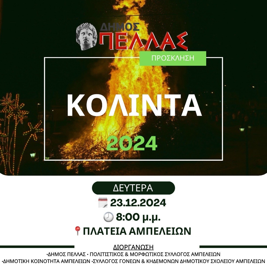 Ο Δήμος Πέλλας σας προσκαλεί τη Δευτέρα 23 Δεκεμβρίου 2024 και ώρα 8:00 μ.μ. στην πλατεία της Δημοτικής Κοινότητας Αμπελειών στα ΚΟΛΙΝΤΑ του Δήμου Πέλλας.