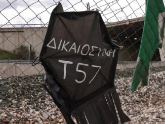 Οι συγκεντρωθέντες άφηναν από ένα λουλούδι στη μνήμη των 57 νεκρών, με κεράκια να έχουν τοποθετηθεί κάτω από τις φωτογραφίες θυμάτων της σιδηροδρομικής τραγωδίας.