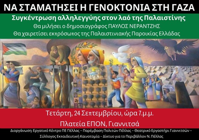 Καλούμε τους πολίτες της Πέλλας σε συγκέντρωση αλληλεγγύης στον λαό της Παλαιστίνης, την Τετάρτη, 24 Σεπτεμβρίου 2025, ώρα 7:00΄ μ.μ.,  στην Πλατεία ΕΠΟΝ, στα Γιαννιτσά.