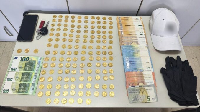 Επίσης από την κατοχή του κατασχέθηκαν 3 χρυσές λίρες και το χρηματικό ποσό των 300 ευρώ.