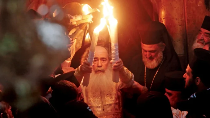 Η κορυφαία στιγμή της τελετής αφής του Αγίου Φωτός στα Ιεροσόλυμα είναι όταν ο Ελληνορθόδοξος Πατριάρχης βγαίνει από τον Πανάγιο Τάφο κρατώντας 33 αναμμένες λαμπάδες.