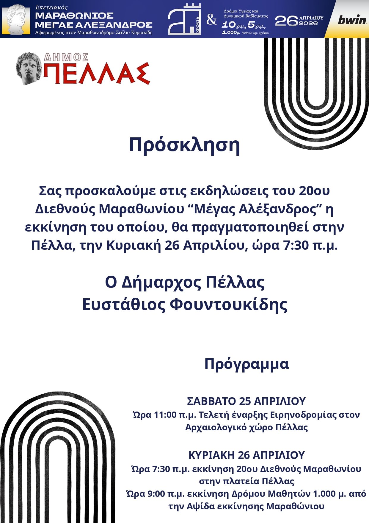Η Τελετή Έναρξης της Αλεξανδρείου Ειρηνοδρομίας από το Δήμο Πέλλας σε συνεργασία με την Εφορεία Αρχαιοτήτων Πέλλας,στο πλαίσιο του 20ου Διεθνούς Μαραθωνίου «Μέγας Αλέξανδρος», θα πραγματοποιηθεί στον Αρχαιολογικό Χώρο της Πέλλας, το Σάββατο 25/4, ώρα 11.00π.μ., με την πρωταθλήτριά μας, Πολυνίκη Εμμανουηλίδου.