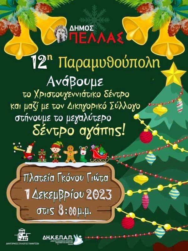 Σε εορταστικό κλίμα και Χριστουγεννιάτικη ατμόσφαιρα θα πραγματοποιηθεί την Παρασκευή 1 Δεκεμβρίου, στις 8.00 μ.μ., στην πλατεία Γκόνου Γιώτα, στα Γιαννιτσά, η εκδήλωση για το άναμμα του Δέντρου των Χριστουγέννων του Δήμου Πέλλας αλλά και την φωταγώγηση της πόλης των Γιαννιτσών, προσδίδοντάς της έτσι την γιορτινή λάμψη των Χριστουγέννων.